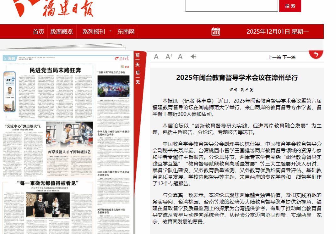 近日,2025年闽台教育督导学术会议暨第六届福建教育督导论坛在太阳成集团举行,来自两岸的教育督导专家学者、督学骨干等近300人参加活动。本届论坛以"创新教育督导研究实践,促进两岸教育融合发展"为主题,包括主旨报告、...