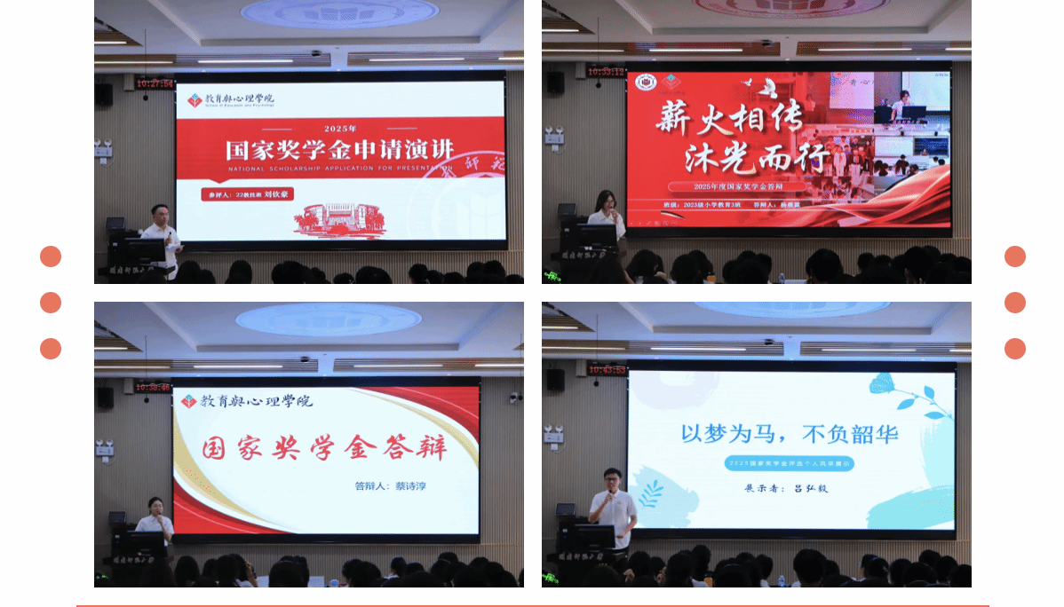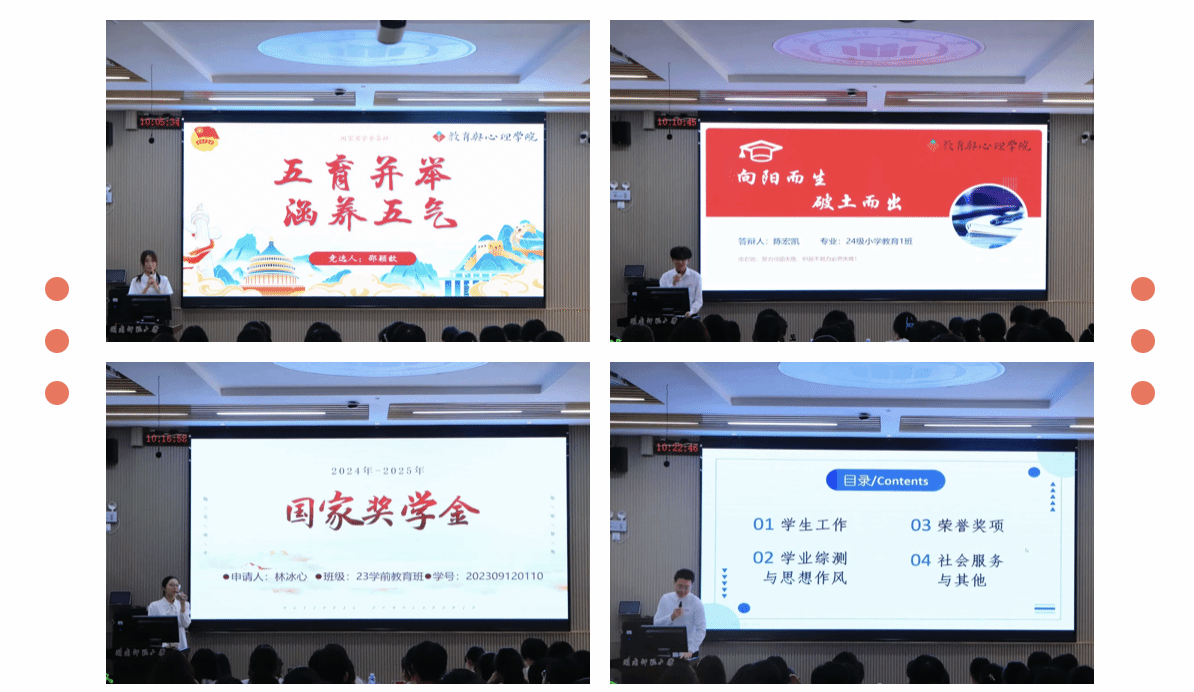 评选会上,邵颖歆、陈宏凯、林冰心、陈志武、刘钦豪、杨晨霖、蔡诗淳和吕弘毅依次登台。他们从思想政治、专业知识、团学工作、技能竞赛、志愿服务等多个维度,全面展示个人综合风采。在逐梦征程中,他们作为教心学子始终博学善思、砥砺笃行,以脚踏实地的行动浇灌梦想,用昂扬向上的姿态直面挑战,充分展现了新时代青年朝气蓬勃、奋发有为的精神风貌。