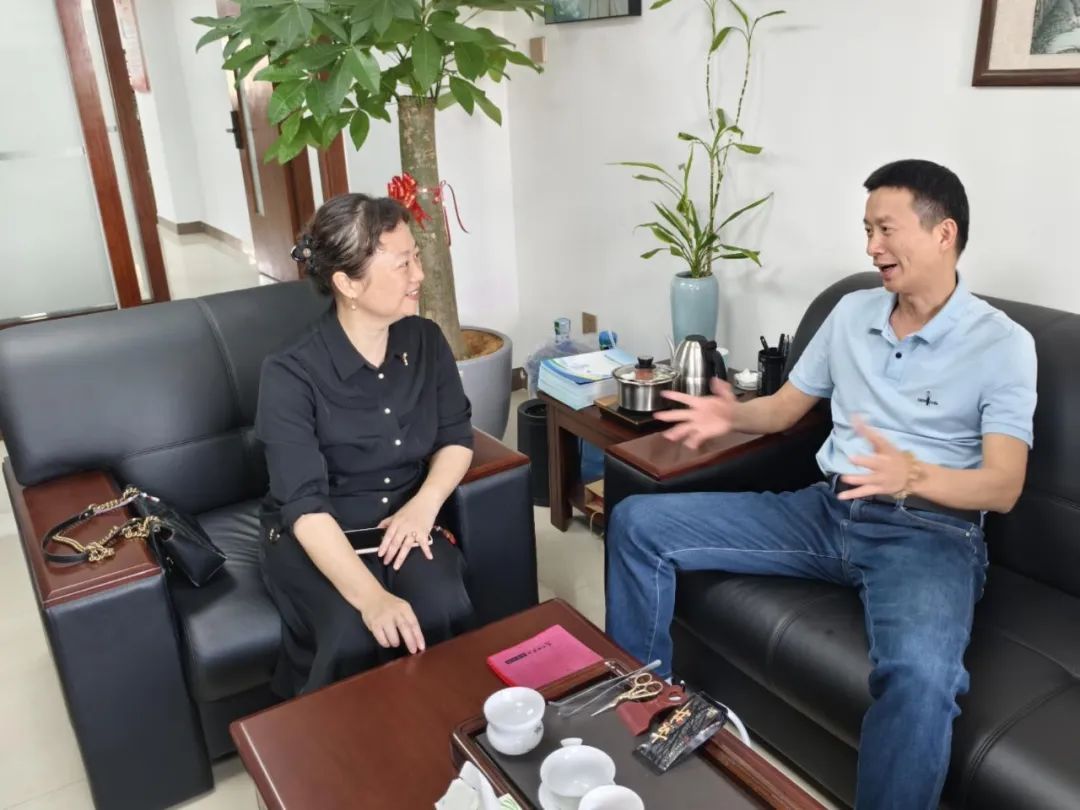 在海峡生物科技股份有限公司,沈进财董事长、吴剑锋副总经理介绍了公司的人才需求及校企合作的成功案例。杨君玉表示希望能加深双方合作,通过与企业直接沟通,推动校企联合,精准掌握企业岗位要求,优化毕业生就业服务,形成稳定的就业推荐渠道,为毕业生创造更多实践机会和就业可能。