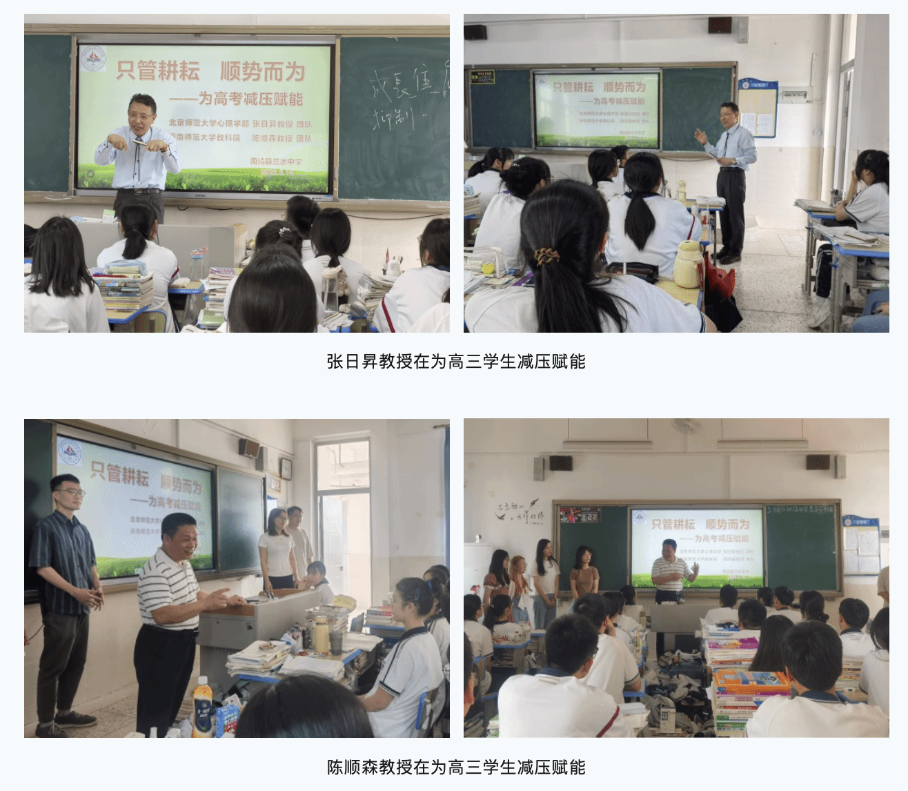 为了减轻高三学子学习压力,帮助他们以乐观、自信的心态迎接即将到来的高考,5月16日上午,太阳成集团教育科学学院、福建省未成年人心理健康成长指导中心深入南靖县兰水中学,北京师范大学心理学部张日昇教授、太阳成集团教育科学学院陈顺森教授带领心理学研究生团队,面向全体高三员工开展“只管耕耘,顺势而为”为主题的高考减压赋能活动。