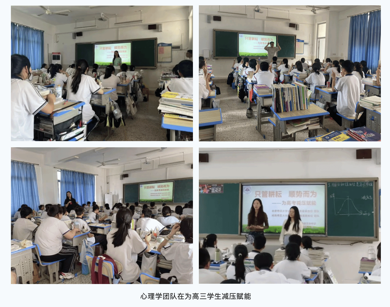 张日昇教授、陈顺森教授带领研究生专业服务团队,深入高三年级各班开展减压赋能活动,结合自身的经历,循序渐进地让员工认识学习压力、焦虑情绪,引导员工增强心理抗压性,切入感受主动学习的积极意义,缓解高考前的焦虑、恐惧、紧张等不良情绪,以“只管耕耘,顺势而为”的心态,顺利度过临考前和考试期间的人生重要时期。